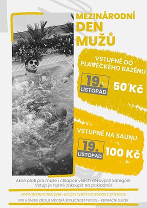 Muži všech věkových kategorií budou mít v tento den vstup do Krytého plaveckého bazénu za 50 Kč, zlevněné vstupné bude platit i na Sauně, kde bude vstupné 100 Kč.