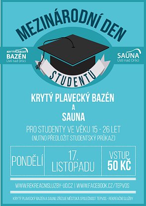 I letos s vámi oslavíme 17. listopad - Mezinárodní den studentů, a to vstupem do Krytého plaveckého bazénu i Sauny za symbolických 50 Kč